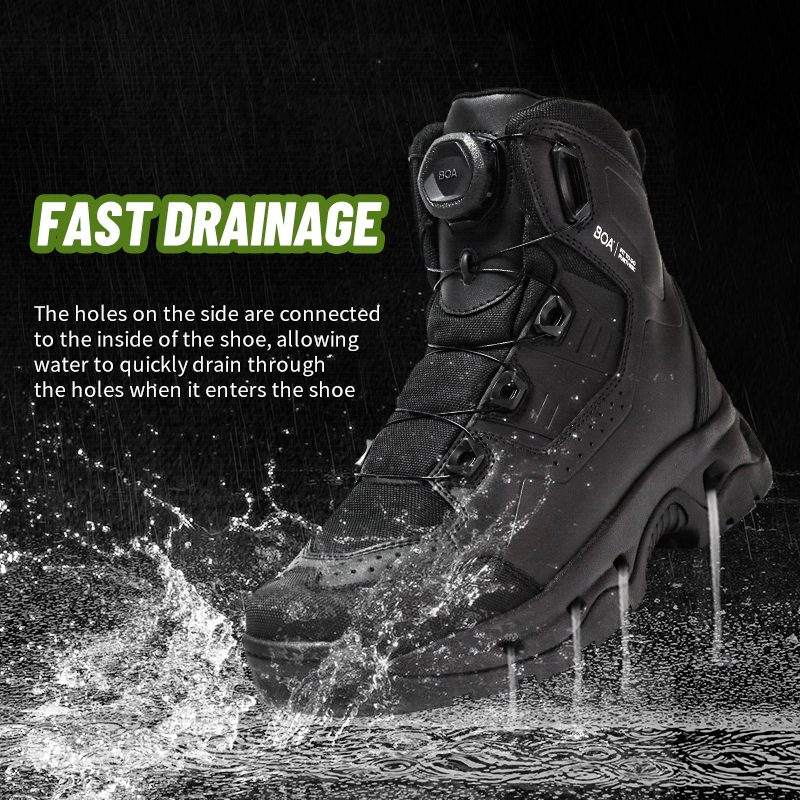 Tá na poill ar an taobh ceangailte leis an taobh istigh den bróg, rud a ligeann uisce a dhraenáil go tapa trí na poill nuair a théann sé isteach sa bróg.
