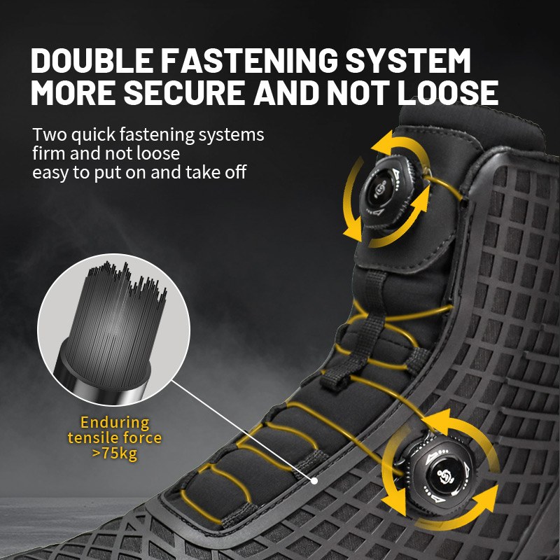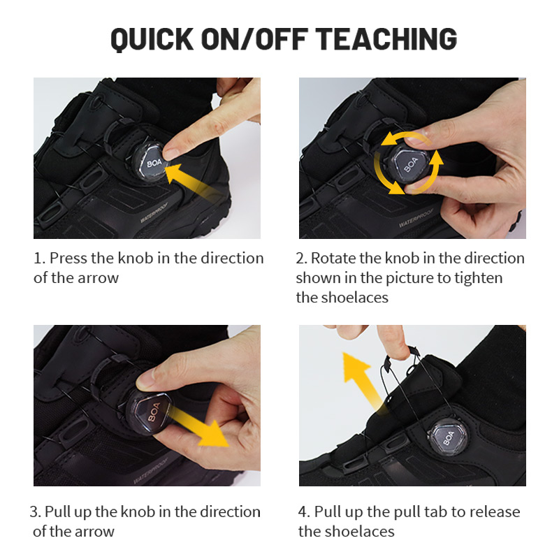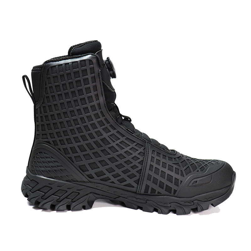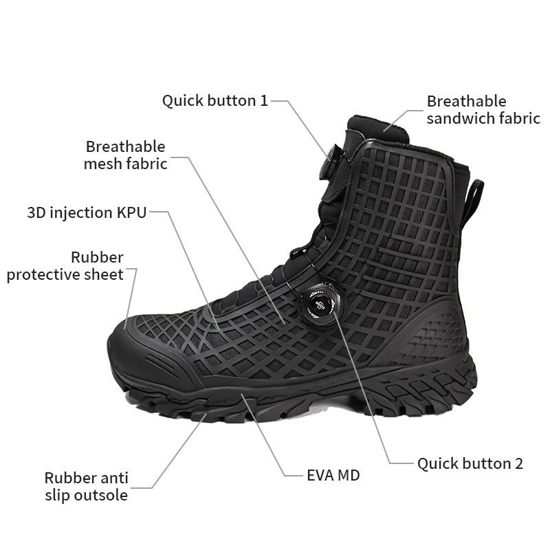 Athsainmhíníonn buataisí comhraic le córas ceanglóir dúbailte, atá feistithe le córas dé-luas-lacing, wearability agus oiriúnach slán. Le tarraingt agus cliceáil simplí, glasann sé i bhfeidhm láithreach, rud a chuireann deireadh leis an mbaol lásaí scaoilte. Tugann sé buntáiste ríthábhachtach duit le linn misin éigeandála agus imscaradh tapa. Cinntíonn an dearadh eirgeanamaíochta glasáil agus tacaíocht rúitín uile-thimpeall, rud a chumasaíonn duit dul i ngleic le tír-raon dúshlánach go muiníneach. Seol fiosrúchán chugainn le haghaidh tuilleadh eolais.